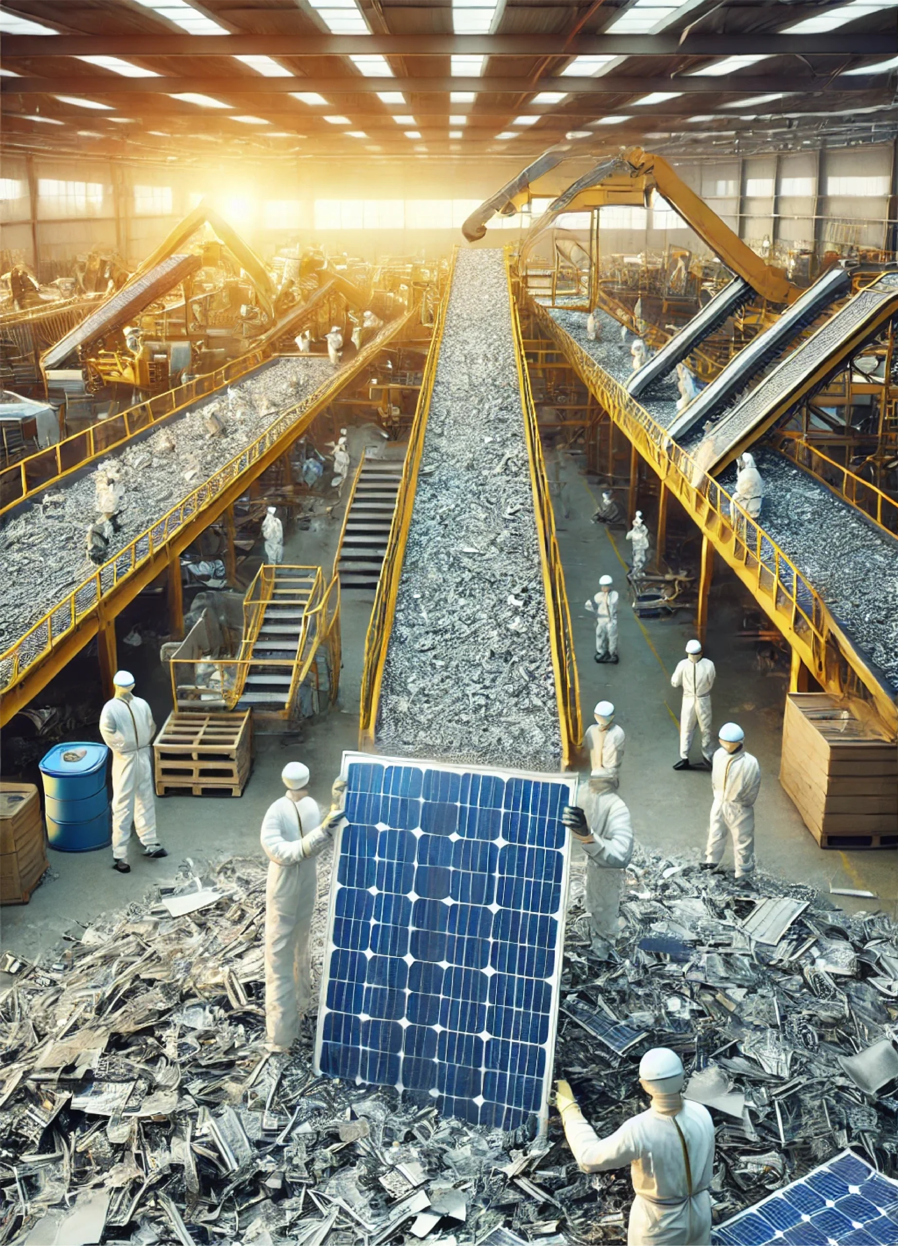 Silicon from the PV modules is obtained through primary crushing using a rotary-disc machine and further processed in a drum mill to create silicon powder, which is then reused in the manufacturing of lithium batteries and electronics.